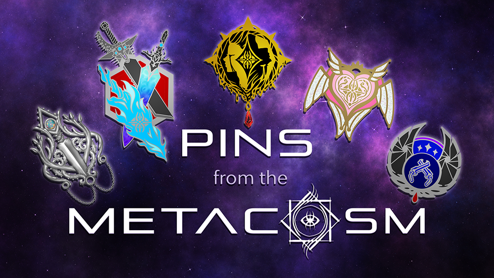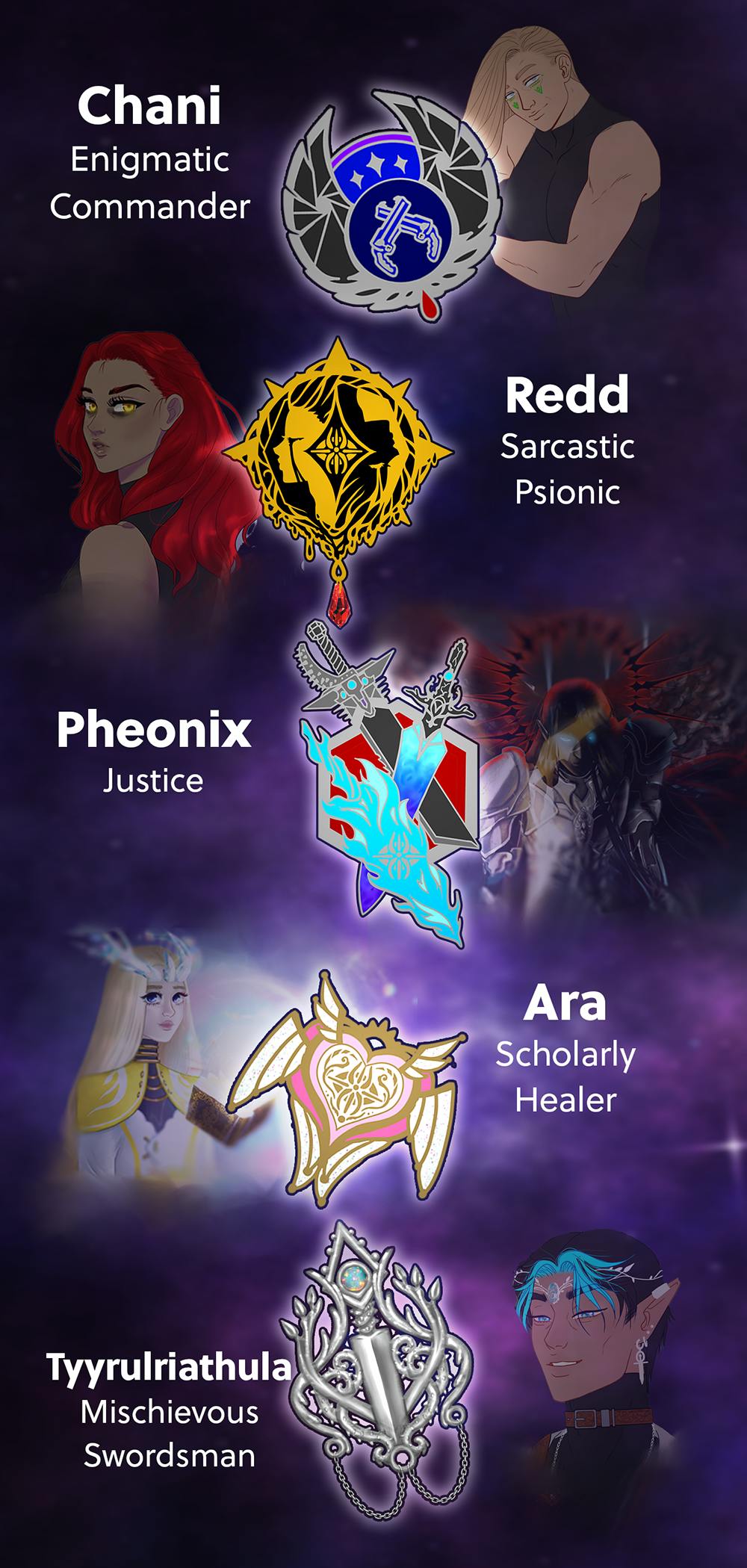 Our hard enamel pins are representative of the main five characters of the two published Metacosm Chronicles, Everdark and The Fractured Balance; Redd, Pheonix Barandor, Ara Invenes, Chani Abyss, and Tyyrulriathula.
