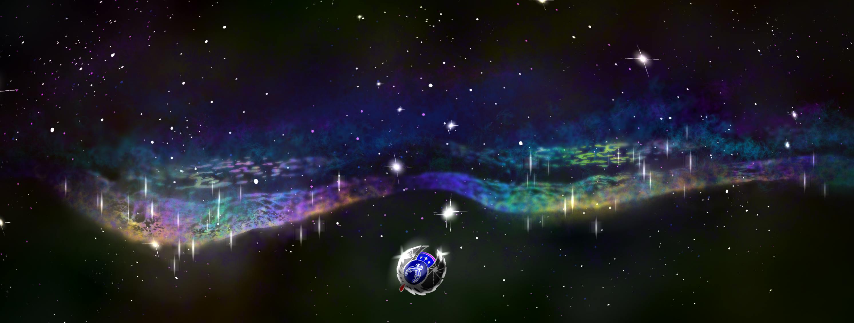 You find yourself standing on this shore, and at your feet is a small, glimmering, round object. It is emblazoned with twin blue pistols and mechanical wings whose aperture-shaped spots unnervingly give you the sense that you are being observed. You see other sharp glints of light farther out, where reality spins out into the fractals of imagination and potentiality, as though similar objects lie in a staggered line, leading you to who-knows-where....