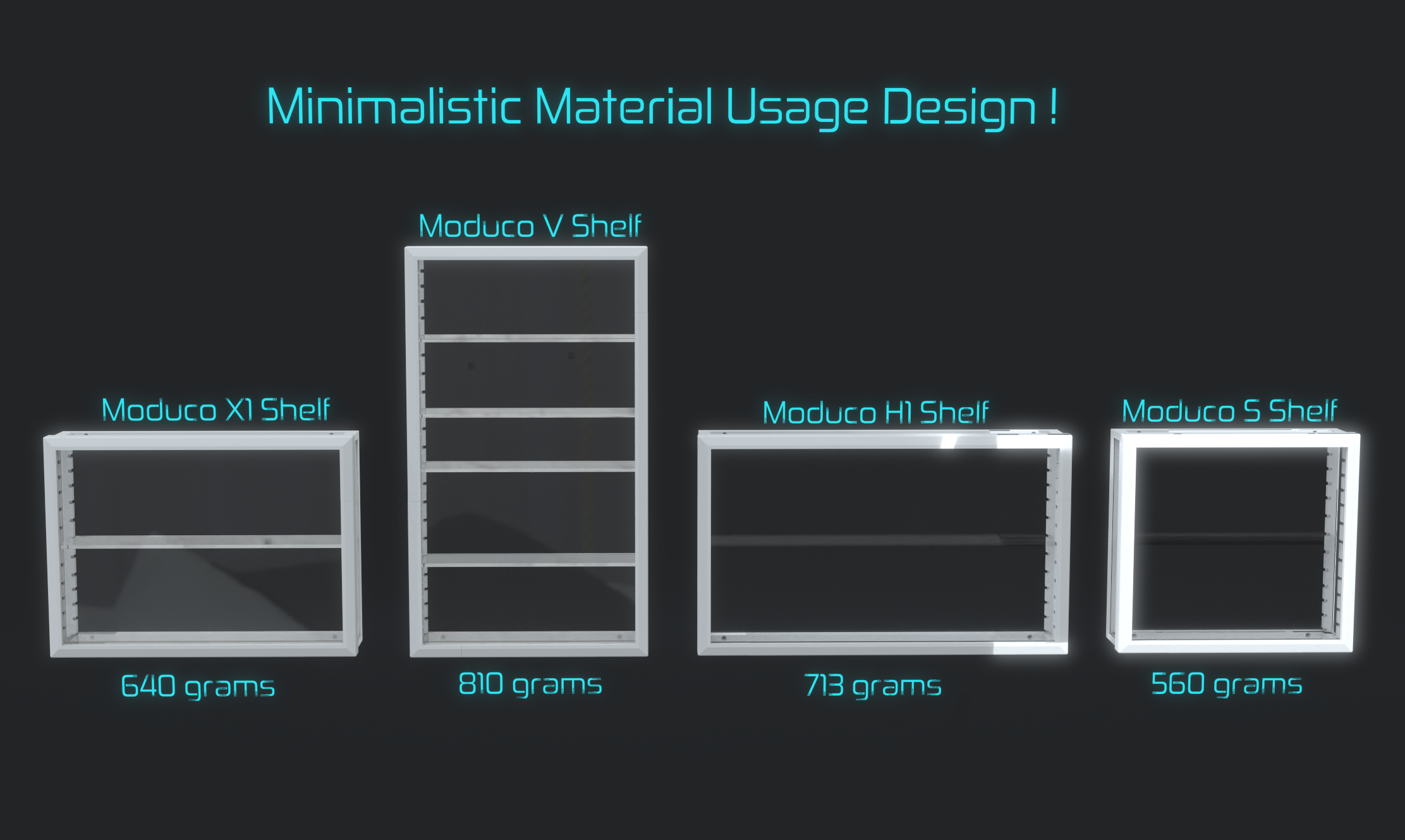 Moduco is designed by a 3D Printing hobbyist for 3D printer hobbyists. This perspective lead the focus in the design of Moduco to ensure its design is as material efficient as possible. Depending on Moduco Shelf size type chosen, you can print your own shelf with as little as 560 grams of PLA filament!