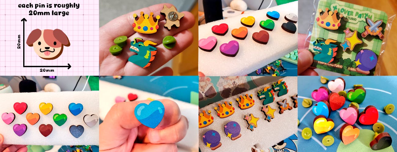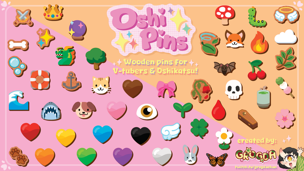How are they made? Oshi Pins are created starting with sustainably sourced cherry wood, then artwork that I (Grogda) have digitally drawn with love gets printed onto the wood using high quality ink, after that gloss is applied as needed, next the cherry wood is laser cut around the artwork to get the shape of our pins, lastly a pin backing is adhered to the back and given a cute little green clutch. Viola~! We have our Oshi Pins!
