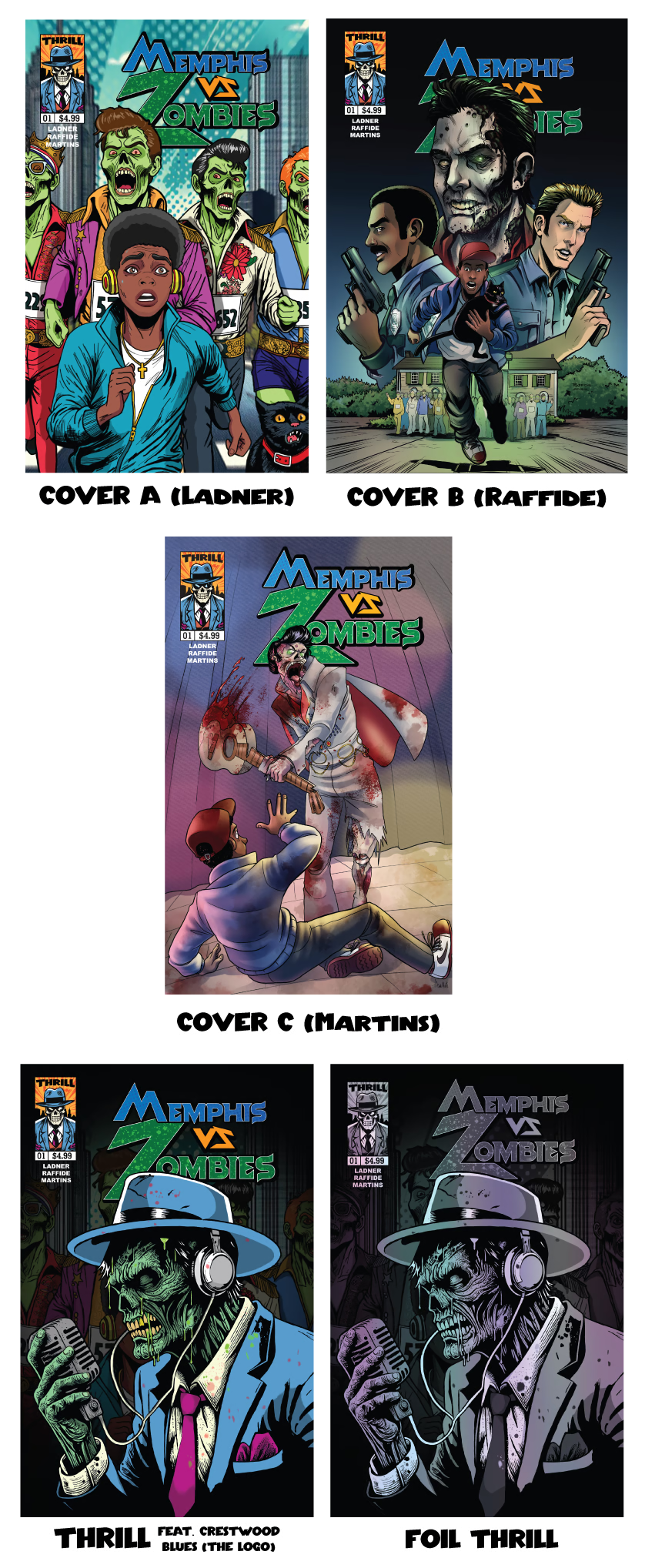 Memphis vs Zombies #1has a handful of exciting variant covers to choose from by creators Ryan Ladner, Guilherme Raffide and Aline Martins. The Thrill Comics variants feature a zombified version of Crestwood Blues, the official mascot of Thrill.