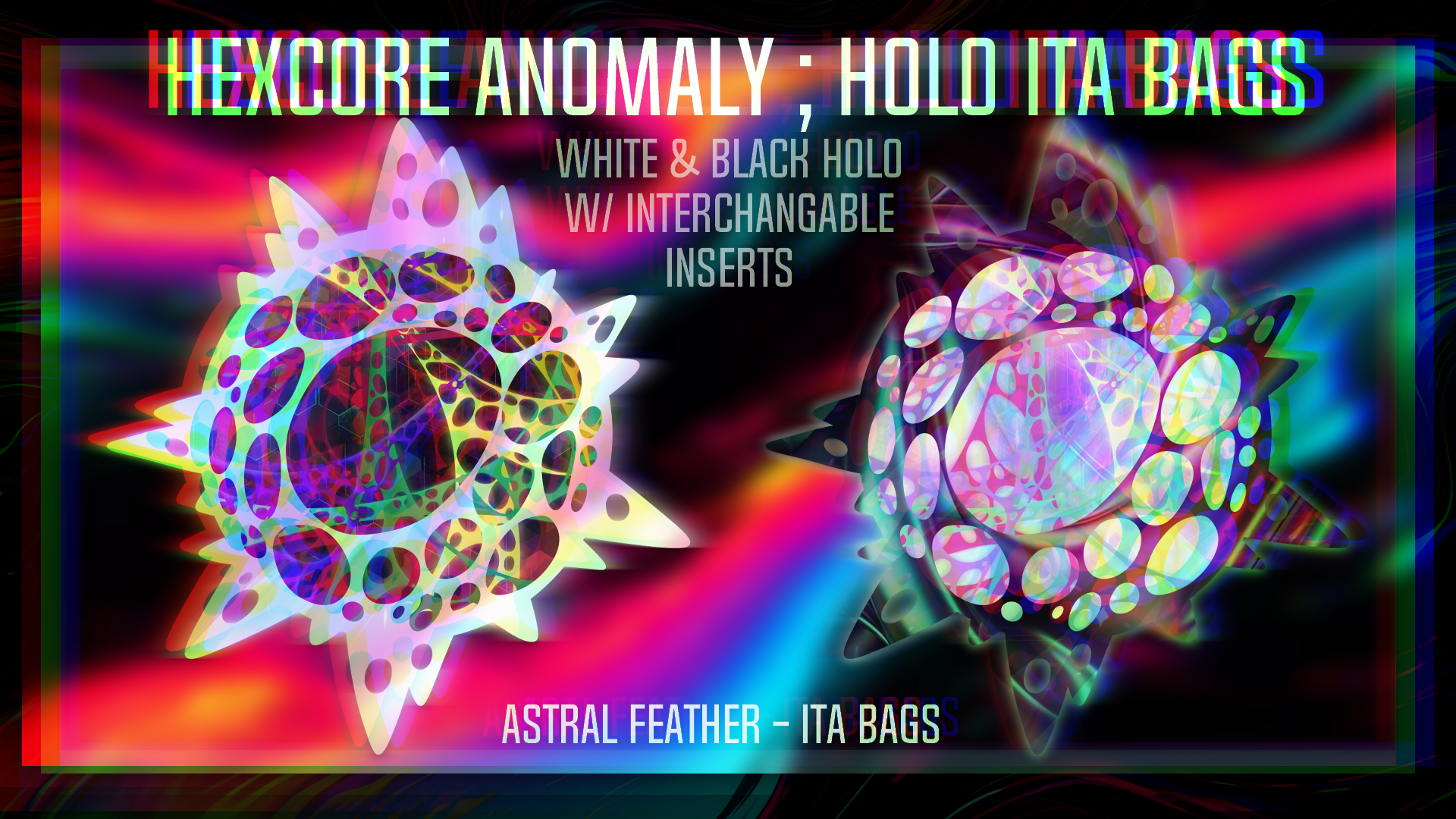 Arcane Hexcore Anomaly Ita Bags – 10x10in holographic backpacks inspired by Arcane's wild runes. Choose black or white holo shells with either bold black or soft pastel inserts. Stylish, compact, and ready for magical display.