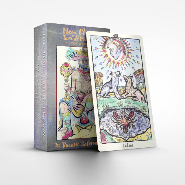 A modern interpretation of a Tarot de Marseille, hand-painted with bold lines and shining colours.