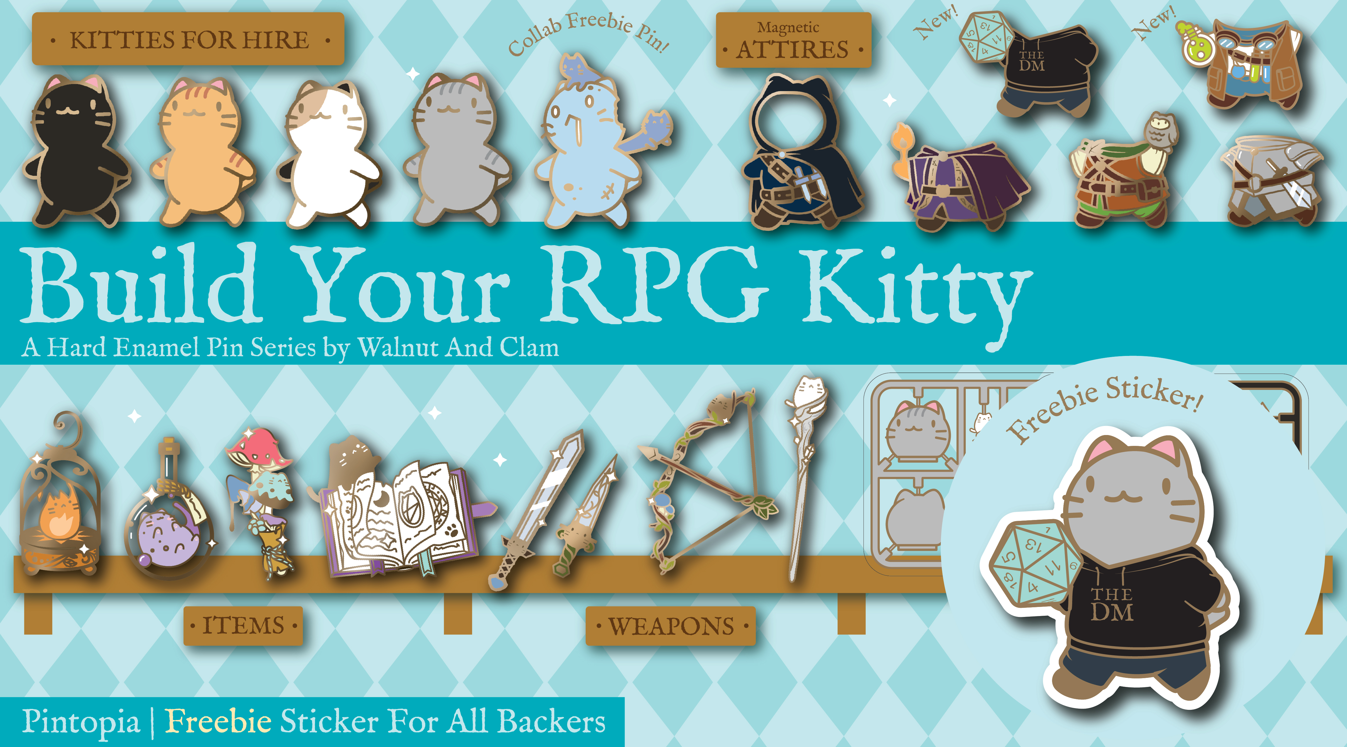 A hard enamel pin series inspired by role playing games where you can design your very own characters.